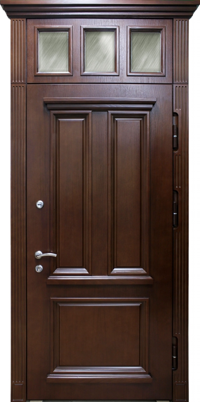 Дверь с сувальдным замком и фрамугой №34 идеально сочетает в себе стиль и надежность. Панель из натурального дерева, использованная как для внешней, так и для внутренней отделки, придает двери благородный и элегантный вид, делая её отличным выбором для помещений с классическим или современным интерьером. Каркас двери выполнен из профильной трубы 50х25 мм и усилен ребрами жесткости, что гарантирует прочность конструкции. Замки от производителей "Просам" и "Мосрентген" с тремя ригелями обеспечивают высокий уровень безопасности. Дверь оснащена уплотнителями с двумя контурами, что гарантирует отличную герметичность, а возможность замены замков и добавления кованых элементов делает её адаптируемой под любые требования. Кроме того, дверь можно дополнить зеркалом, стеклопакетом или видеодомофоном для еще большего комфорта. Входная дверь с сувальдным замком и фрамугой №34 от производителя: быстрое изготовление и монтаж в Москве, индивидуальные размеры, широкий выбор материалов и фурнитуры, официальная гарантия до 10 лет.